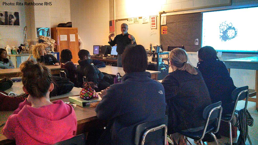 Photography Dept. Head Chuck Egerton visited Riverside High School's Photography class for the second year November 14. About 50 students from two classes heard a presentation about the RCC Photography Program including student photography and multimedia work. Photography teacher Rita Rathbone introduced the presentation saying two of her graduates have attended the RCC program. Riverside students get extensive experience with black and white film and darkroom work and are currently studying the impact of photography during the Civil Rights Movement.